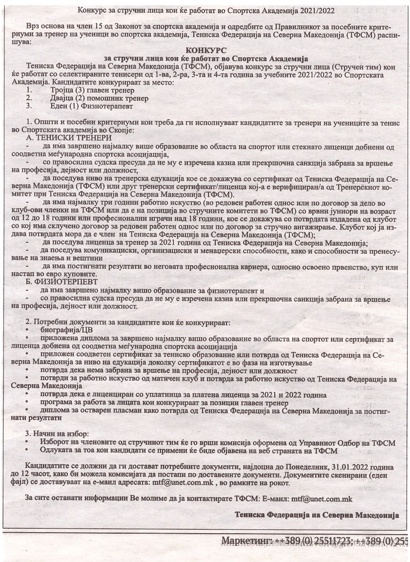 Тениска Федерација на Северна Македонија (ТФСМ), објавува конкурс за стручни лица (Стручен тим) кои ќе работат со селектираните тенисери од 1-ва, 2-ра, 3-та и 4-та година за учебните 2021/2022 во Спортската Академија. Кандидатите конкурираат за место: