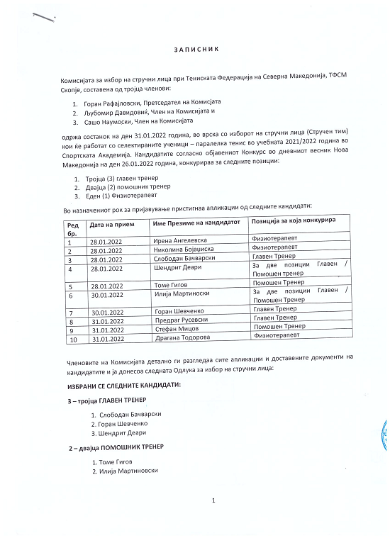 Согласно Одлуката донесена од Комисијата за избор на стручни лица при ТФСМ избрани се следните кандидати кои ќе работат со селектираните ученици - паралелка тенис во учебната 2021/2022 година во Спортската Академија: